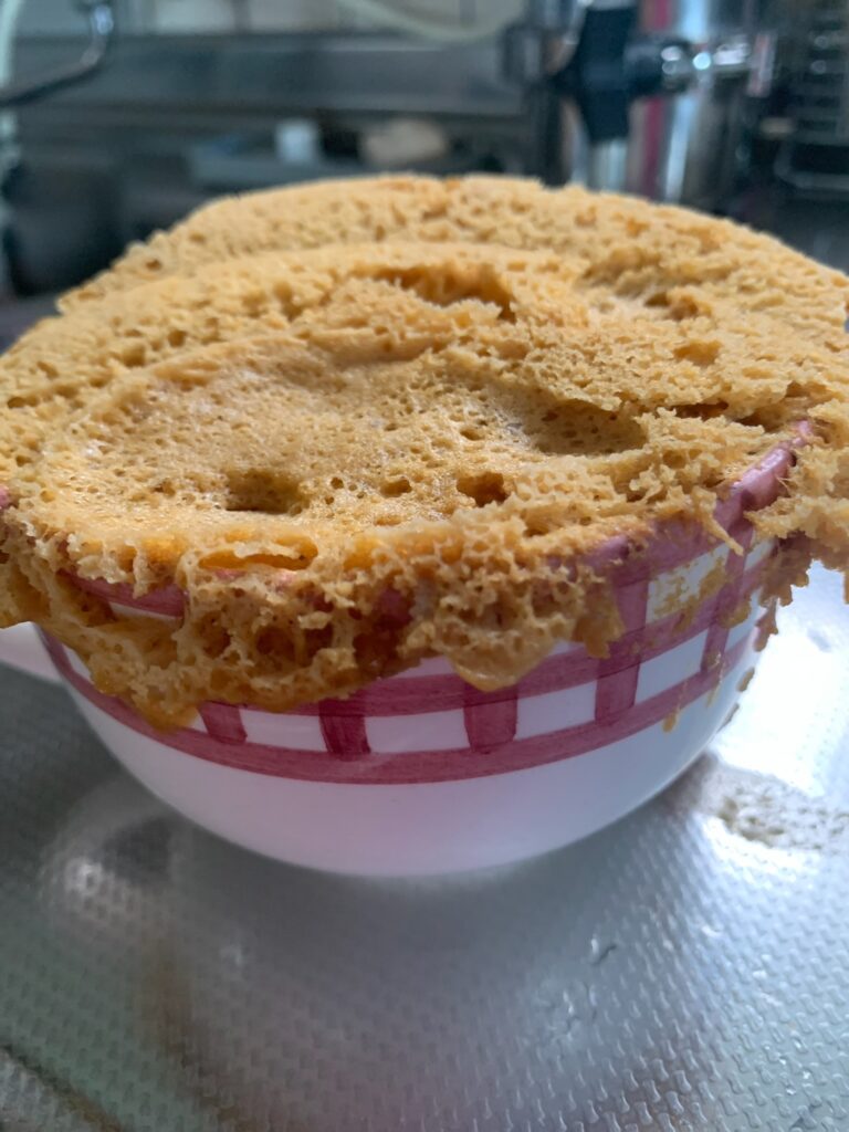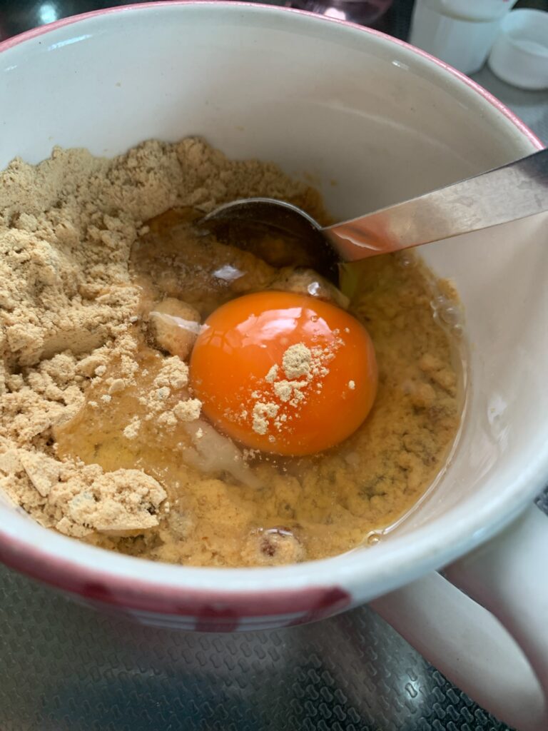 マグカップにきな粉と黒みつを入れて混ぜる。電子レンジ600Wで2分半!美味しいカップケーキの出来上がり!